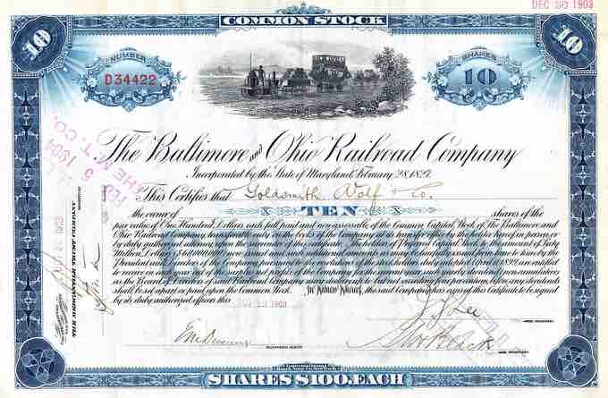 1903 stock certificate of the Baltimore and Ohio Railroad