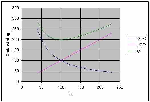 Inventory control - inventory cost elements (holding cost, order cost, total)Parameters: Order-cost (C) 10, demand (D) 1000, holding cost (i) 20% (of price), price (p) 10 => EOQ = 100