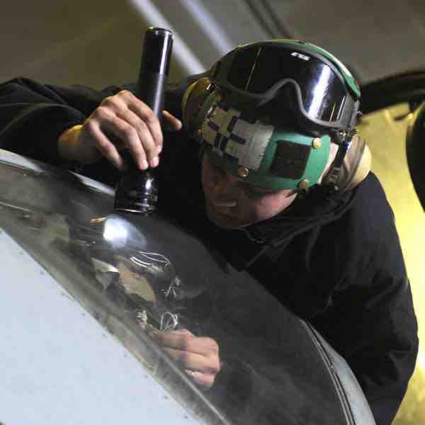 A U.S. Navy Aviation Electrician's Mate performs a maintenance check during the course of his duties.