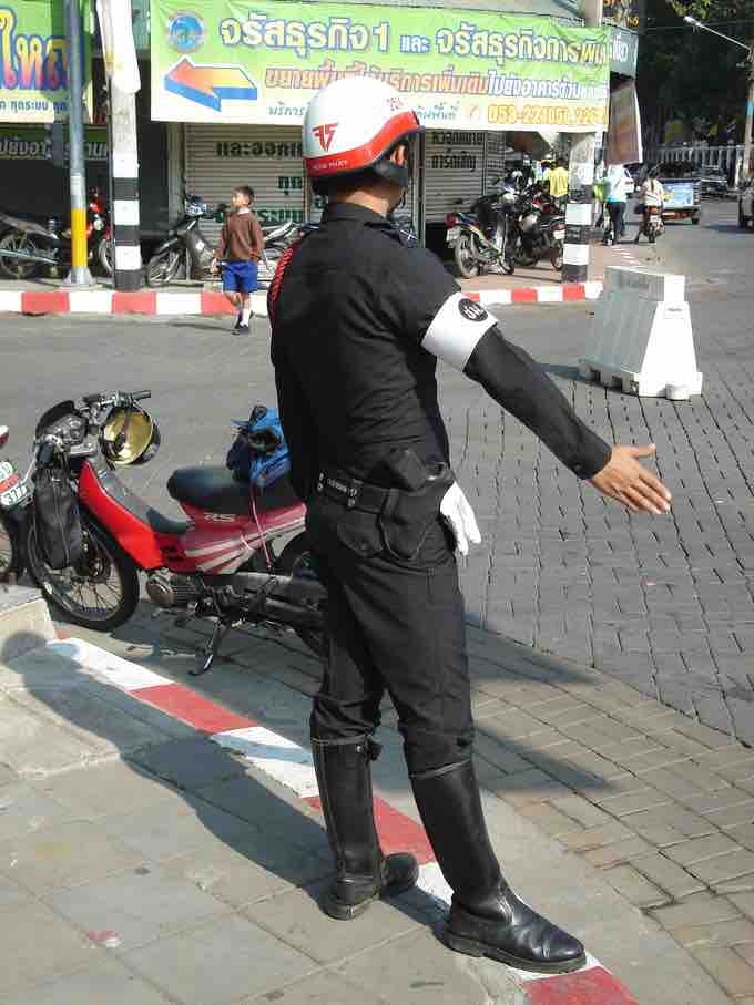 A police officer using nonverbal communication to indicate an action that needs to be performed.
