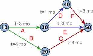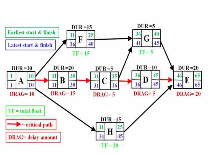 A CPM chart is similar to a PERT chart but includes more detail about the latest and earliest possible times at which each stage of the project must be completed. The earliest possible time (in green) are calculated by determining the earliest start times of all activities on the critical path before that activity. The latest possible times (in blue) are calculated by adding all of the latest possible times of the activities before the critical path. In this CPM chart, the critical path is A-B-C-D-E since that pathway takes the most time to complete of any of the other potential pathways available. The total float time (lime green), or TF, represents the amount of time flexibility a task has between start and end times.