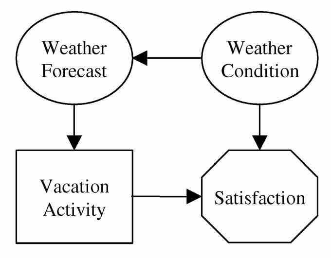 In the scenario depicted by the influence diagram above, a person is choosing between vacation alternatives. Her goal is a satisfactory vacation, which will be influenced by how good the weather is. She cannot have direct knowledge at the time of the decision what the weather will be, but she can gather information on the weather forecast or other climate patterns to help her make the choice of vacation location.