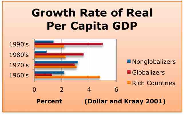 As noted in the chart above, globalizing organizations capture significantly better revenues in modern markets. "Nonglobalizing" countries averaged around 1.5% GDP growth in the 1990s, while globalizing countries averaged around 5% GDP growth.