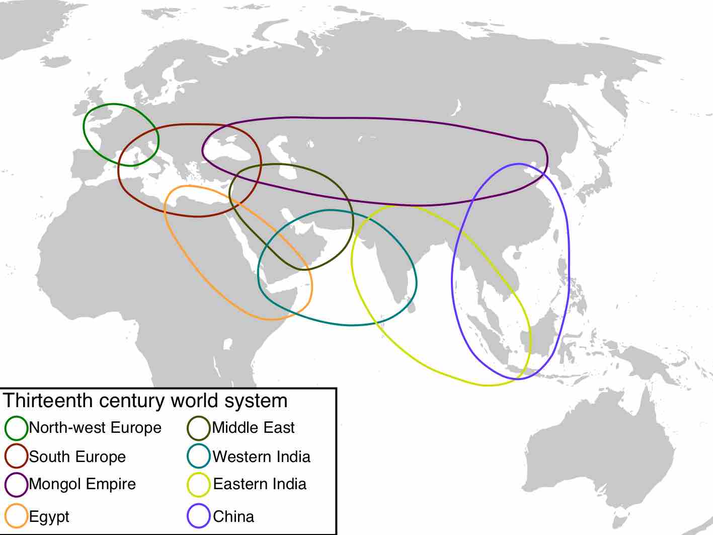 Different regions of trade overlapped; for instance the Mongol Empire's area of influence interacted with Southern European trade interests.