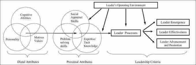 This diagram shows one contemporary theory of the essential traits of a leader. Zaccaro's theory emphasizes all of the attributes that make up the traits of a leader, including environmental, internal (personality), and cognitive abilities.