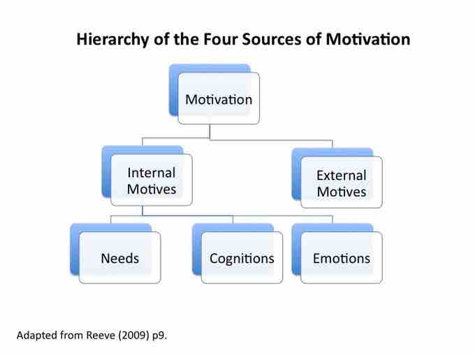 There are four sources of motivation. The three internal motives are needs, cognitions, and emotions. The fourth source consists of external motives.