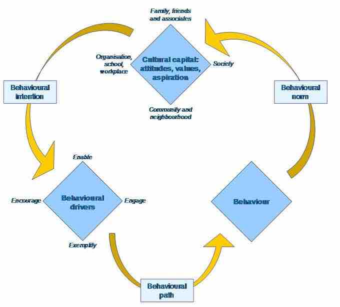 The feedback loop of cultural change in an organization involve people's intentions to enable, engage, encourage, and exemplify the new desired behaviors; this in turn influences the frequency of behaviors. After enough reinforcement, those behaviors become the norm, which self-reinforces through increasing people's exemplification of those behaviors.