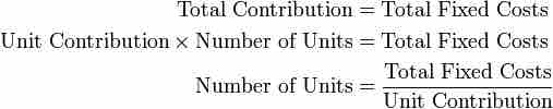 In the linear Cost-Volume-Profit Analysis model, the break-even point - in terms of Unit Sales (X) - can be directly computed in terms of Total Revenue (TR) and Total Costs (TC) as: where TFC is Total Fixed Costs, P is Unit Sale Price, and V is Unit Variable Cost. The quantity (P - V) is of interest in its own right, and is called the Unit Contribution Margin (C). It is the marginal profit per unit, or alternatively the portion of each sale that contributes to Fixed Costs. Thus the break-even point can be more simply computed as the point where Total Contribution = Total Fixed Cost: