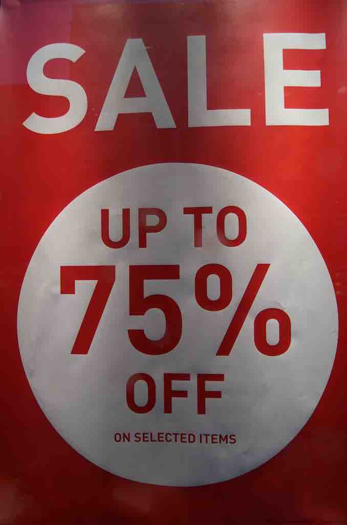 Discounts, such as 75% off, are used to draw customers to purchase items.