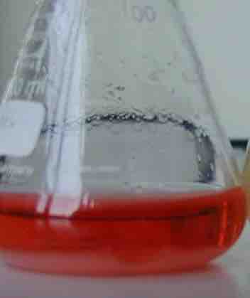 The picture shows the typical red color of the antibiotic Roseoflavin secreted by the Streptomyces cells in the culture.