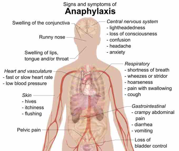 A representation of the signs and symptoms of anaphylaxis that result from an allergic reaction. Signs include CNS symptoms such as confusion or lightheadedness, respiratory symptoms such as shortness of breath, gastrointestinal issues such as pain or vomiting, skin issues such as hives or itchiness, vascular symptoms such as change in heart rate or low blood pressure, and swelling of the mouth or eyes.