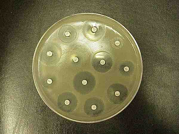 In Kirby–Bauer testing, discs containing antibiotics are placed on agar where bacteria are growing, and the antibiotics diffuse out into the agar. If an antibiotic stops the bacteria from growing, one can see circular areas around the wafers where bacteria have not grown.