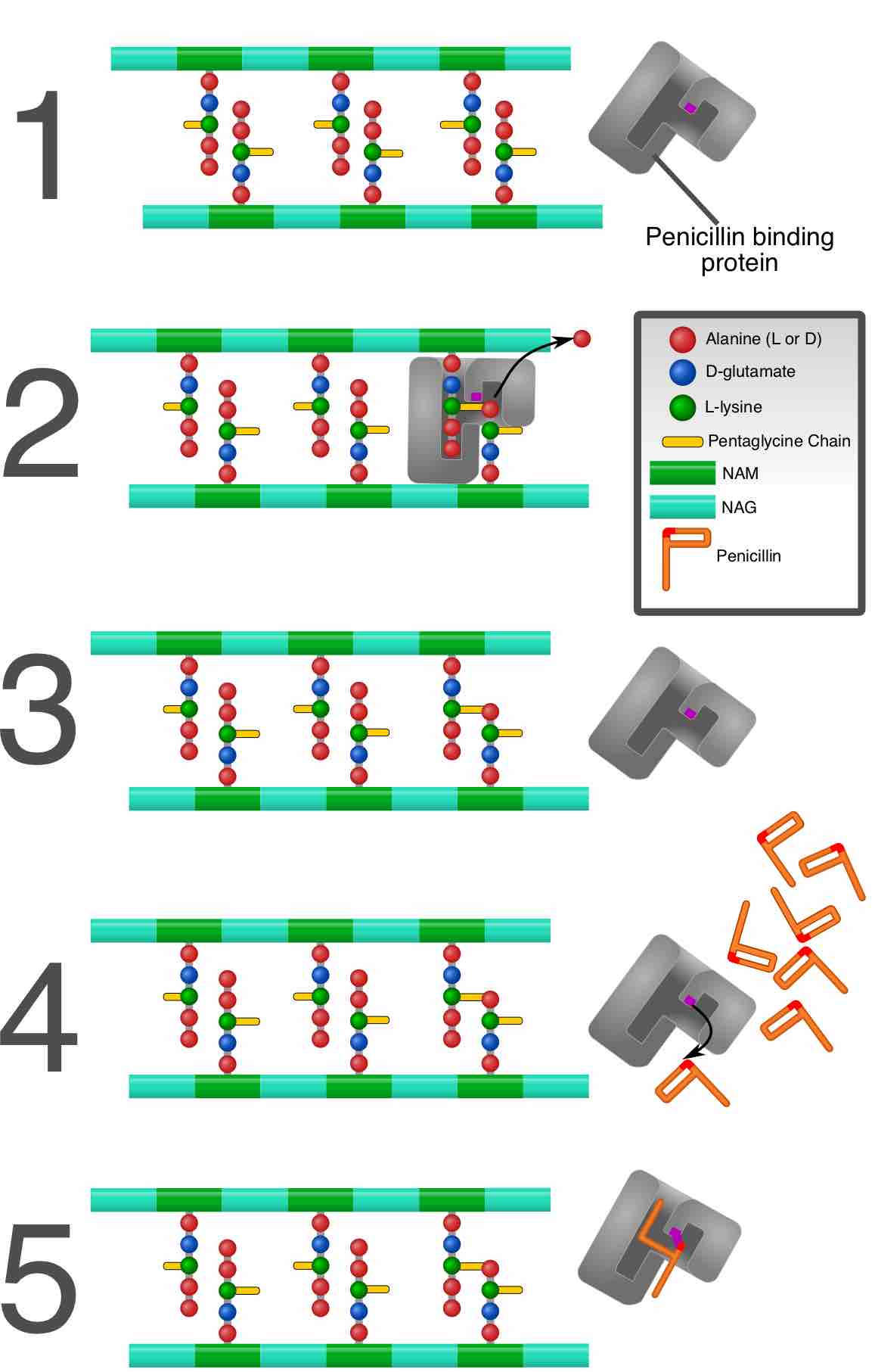 Penicillin and most other β-lactam antibiotics act by inhibiting penicillin-binding proteins, which normally catalyze cross-linking of bacterial cell walls.
