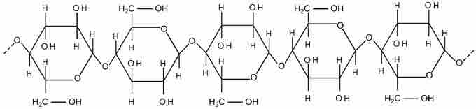 Cellulose is a long chain of β-glucose molecules connected by a 1-4 linkage. The dashed lines at each end of the figure indicate a series of many more glucose units. The size of the page makes it impossible to portray an entire cellulose molecule.