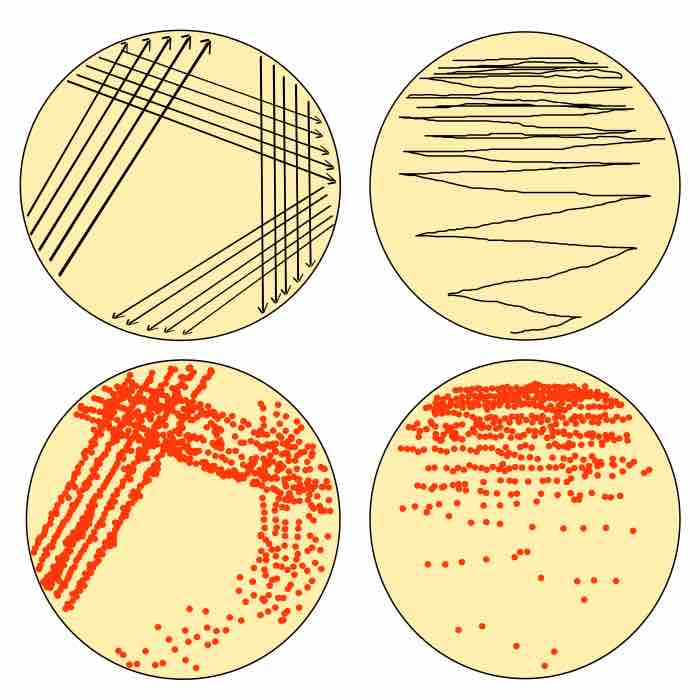 Four streak plates. Successful streaks lead to individual colonies of microbes.