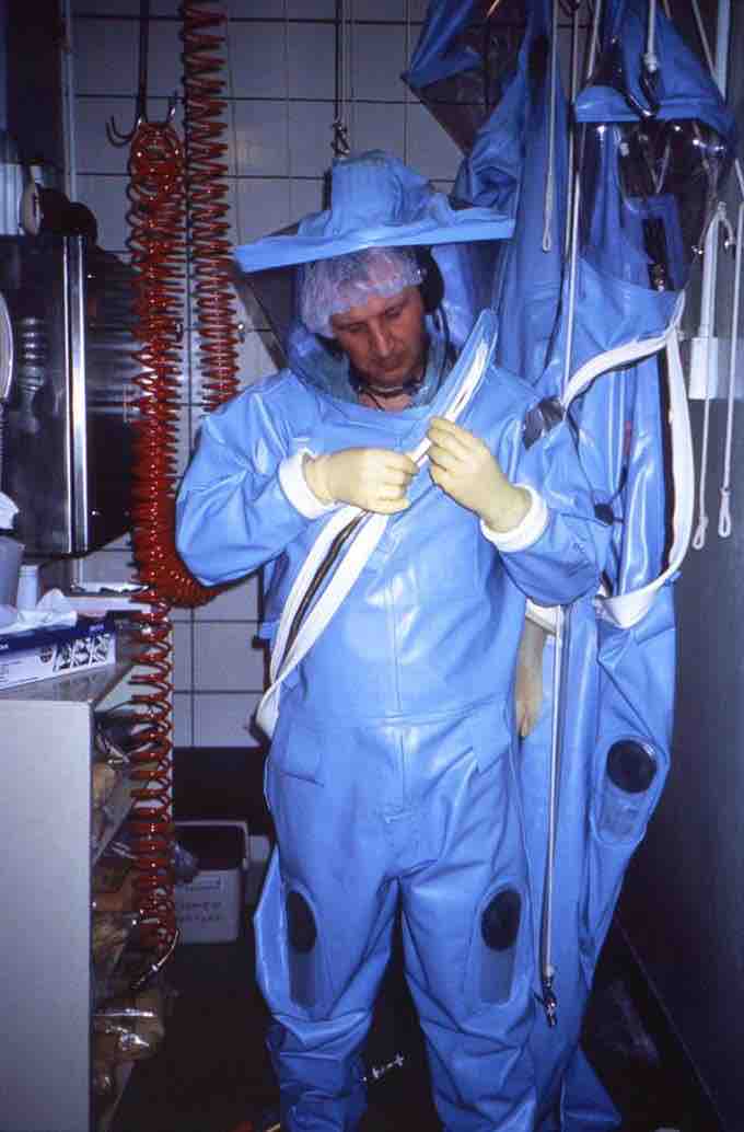 A scientist puts on a positive pressure suit, something needed to work with the most dangerous human pathogens in a biosafety level 4 laboratory.