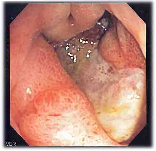 This endoscopic image shows a gastric ulcer, which upon biopsy was shown to be gastric cancer.