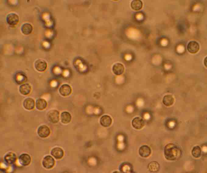 White blood cells in the urine of someone with a UTI, seen under a microscope.