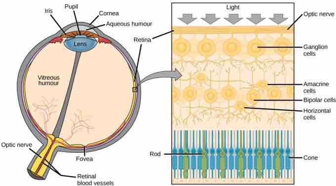 (a) The human eye is shown in cross section. The human eye contains structures, such as the cornea, iris, lens, and fovea, that process light so it can be deciphered by the retina. Other structures like the aqueous humor and the vitreous humor help maintain the shape of the eye. (b) A blowup shows the layers of the retina. The retina contains photoreceptive cells. In the retina, light is converted into neural signals sent to the brain.