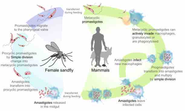 Leishmaniasis is transmitted by the bite of infected female phlebotomine sandflies which can transmit the infection Leishmania. The sandflies inject the infective stage, metacyclic promastigotes, during blood meals. Metacyclic promastigotes that reach the puncture wound are phagocytized by macrophages and transform into amastigotes. Amastigotes multiply in infected cells and affect different tissues, depending in part on which Leishmania species is involved. These differing tissue specificities cause the differing clinical manifestations of the various forms of leishmaniasis. Sandflies become infected during blood meals on infected hosts when they ingest macrophages infected with amastigotes. In the sandfly's midgut, the parasites differentiate into promastigotes, which multiply, differentiate into metacyclic promastigotes, and migrate to the proboscis.
