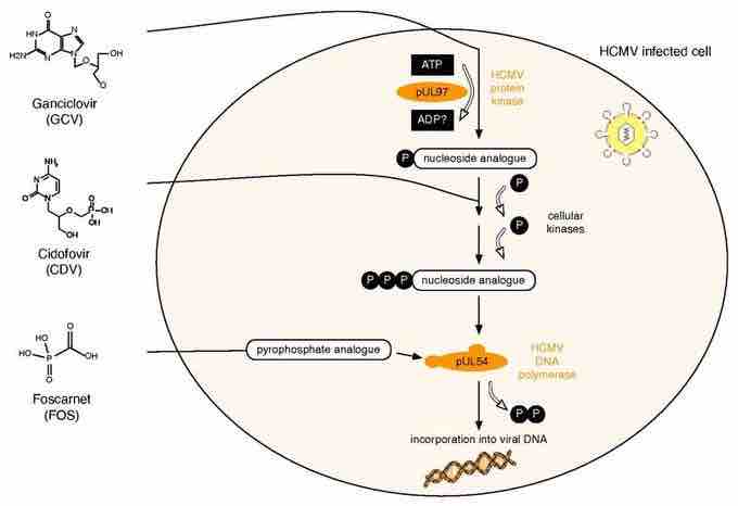 A vaccine against (CMV) is currently under investigation. Because CMV can cause congenital infection, considerable effort has been made towards the development of a vaccine, with particular emphasis on protection for pregnant women. There are currently three licensed anti-HCMV drugs target the viral DNA polymerase, pUL54. Ganciclovir (GCV) acts as nucleoside analogue. Its antiviral activity requires phosphorylation by the HCMV protein kinase, pUL97. The second drug, Cidofovir (CDV), is a nucleotide analogue, which is already phosphorylated and thus active. Finally, Foscarnet (FOS) has a different mode of action. It directly inhibits polymerase function by blocking the pyrophosphate binding site of pUL54 .