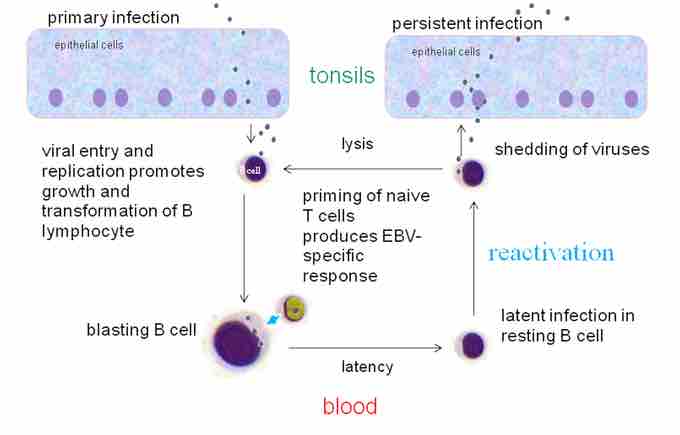 Upon a primary infection, EBV enters the lytic replicative cycle where it infects blood cells. It will remain dormant during the latent stage until it is reactivated into the lytic cycle.