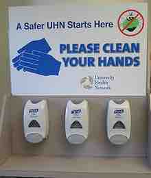 A hand cleaning station at the entrance of the Toronto General Hospital