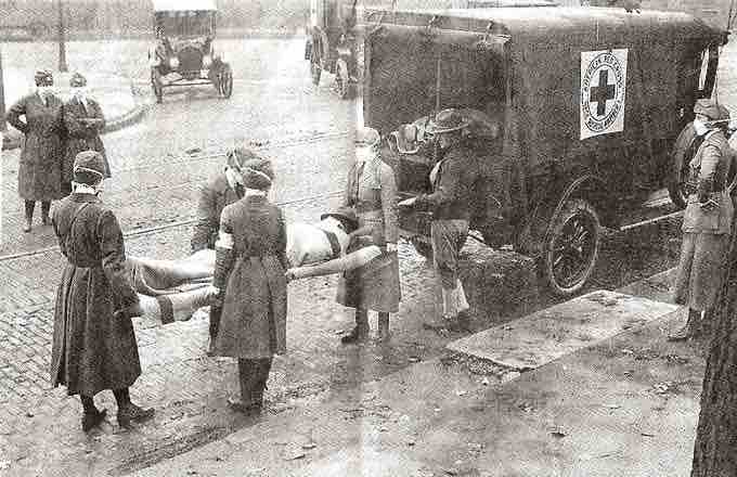 With masks over their faces, members of the American Red Cross remove a victim of the Spanish Flu from a house at Etzel and Page Avenues, St. Louis, Missouri.