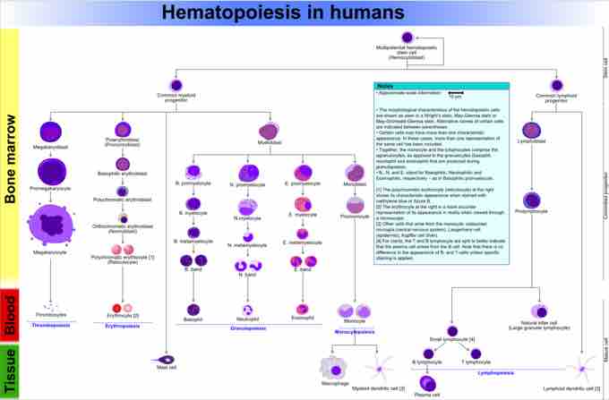 Mammalian stem cells differentiate into several kinds of blood cell within the bone marrow. This process is called haematopoiesis. All lymphocytes originate during this process from a common lymphoid progenitor before differentiating into their distinct lymphocyte types.
