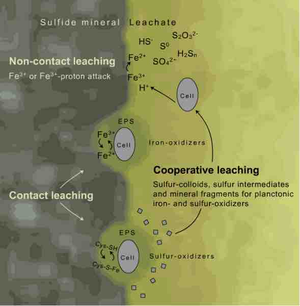 The microbial oxidation process occurs at the cell membrane of the bacteria. The electrons pass into the cells and are used in biochemical processes to produce energy for the bacteria while reducing oxygen to water. The critical reaction is the oxidation of sulfide by ferric iron. The main role of the bacterial step is the regeneration of this reactant.