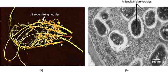 Soybean roots contain (a) nitrogen-fixing nodules. Cells within the nodules are infected with Bradyrhyzobium japonicum, a rhizobia or "root-loving" bacterium. The bacteria are encased in (b) vesicles inside the cell, as can be seen in this transmission electron micrograph.