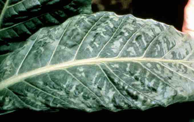 Photo of a tobacco leaf with symptoms of tobacco mosaic virus.