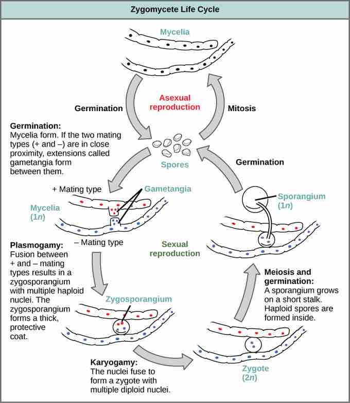 Zygomycetes have asexual and sexual life cycles. In the sexual life cycle, plus and minus mating types conjugate to form a zygosporangium.