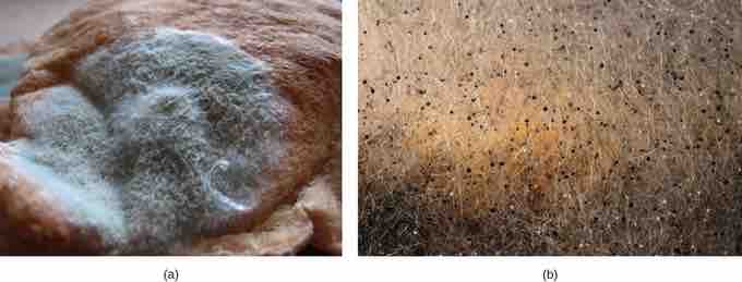 Sporangia grow at the end of stalks, which appear as (a) white fuzz seen on this bread mold, Rhizopus stolonifer. The (b) tips of bread mold are the spore-containing sporangia.