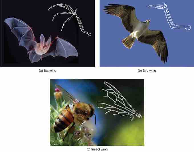 The (c) wing of a honeybee is similar in shape to a (b) bird wing and (a) bat wing, and it serves the same function. However, the honeybee wing is not composed of bones and has a distinctly-different structure and embryonic origin. These wing types (insect versus bat and bird) illustrate an analogy: similar structures that do not share an evolutionary history.