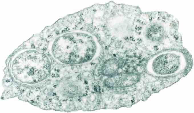 Transmission electron micrograph of Wolbachia within an insect cell.