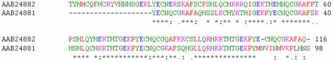This is the sequence alignment of a homologous protein from two different species The "*" represent a conserved amino acid in the two proteins.