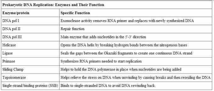 The table summarizes the enzymes involved in prokaryotic DNA replication and the functions of each.