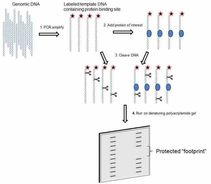 DNA protection or footprinting is a technique from molecular biology/biochemistry that detects DNA-protein interaction using the fact that a protein bound to DNA will often protect that DNA from enzymatic cleavage. This makes it possible to locate a protein binding site on a particular DNA molecule. The method uses an enzyme, deoxyribonuclease (DNase, for short) to cut the radioactively end-labeled DNA, followed by gel electrophoresis to detect the resulting cleavage pattern. For example, the DNA fragment of interest may be amplified by polymerase chain reaction, with the result being many DNA molecules with a radioactive label on one end of one strand of each double stranded molecule. Cleavage by DNase will produce fragments, the smaller of which will move further on the electrophoretic gel.