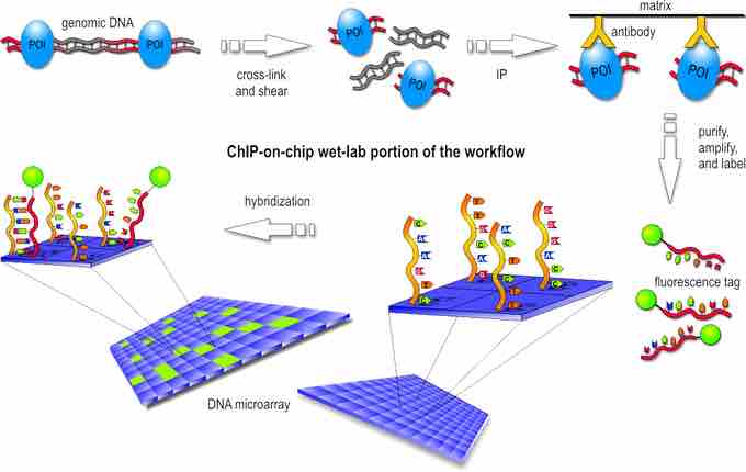 Often, an amplification step is included after DNA purification. Two different fluorescence labels are used to label the IP DNA, and a hybridization-control DNA, respectively. Usually, total DNA before IP (input DNA) is used as hybridization control.