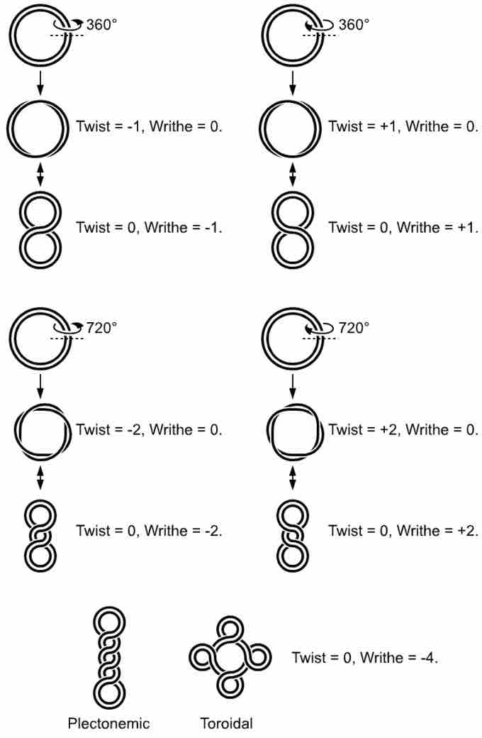 The simple figure eight is the simplest supercoil, and is the shape a circular DNA assumes to accommodate one too many or one too few helical twists. The two lobes of the figure eight will appear rotated either clockwise or counterclockwise with respect to one another, depending on whether the helix is over or underwound. For each additional helical twist being accommodated, the lobes will show one more rotation about their axis.