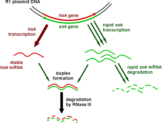 Antisense RNAs are single-stranded RNA molecules that exhibit a complementary relationship to specific mRNAs. Antisense RNAs are utilized for gene regulation and specifically target mRNA molecules that are used for protein synthesis. The antisense RNA can physically pair and bind to the complementary mRNA, thus inhibiting the ability of the mRNA to be processed in the translation machinery. Pairing antisense RNA is a technique that can be utilized within the laboratory for gene regulation -- however, it is not without limitations. Naturally occurring antisense RNAs have been isolated in a various microbes, including the E. coli RI plasmid, which uses a hok/sok system. A hok/sok system is a mechanism employed by E. coli that is used as a postsegregational killing mechanism. The hok gene is a toxic gene and the sok gene is an antitoxin. Hence, E. coli utilizing this system can regulate the expression of hok (toxin) and inhibits its translation by producing sok RNA (antitoxin). The outcome is the repression of hok mRNA translation.