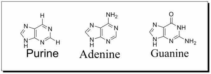 A purine is a nucleotide (a nucleoside + phosphate group) that is amine based and planar, aromatic, and heterocyclic. The structure of purine is that of a cyclohexane(pyrimidine group) and cyclopentane(imidazole group) attached to one another; the Nitrogen atoms are at positions 1,3,7,9. Adenine(A) and Guanine(G) are examples of purines which are involved in the construction of the backbone of the DNA and RNA.