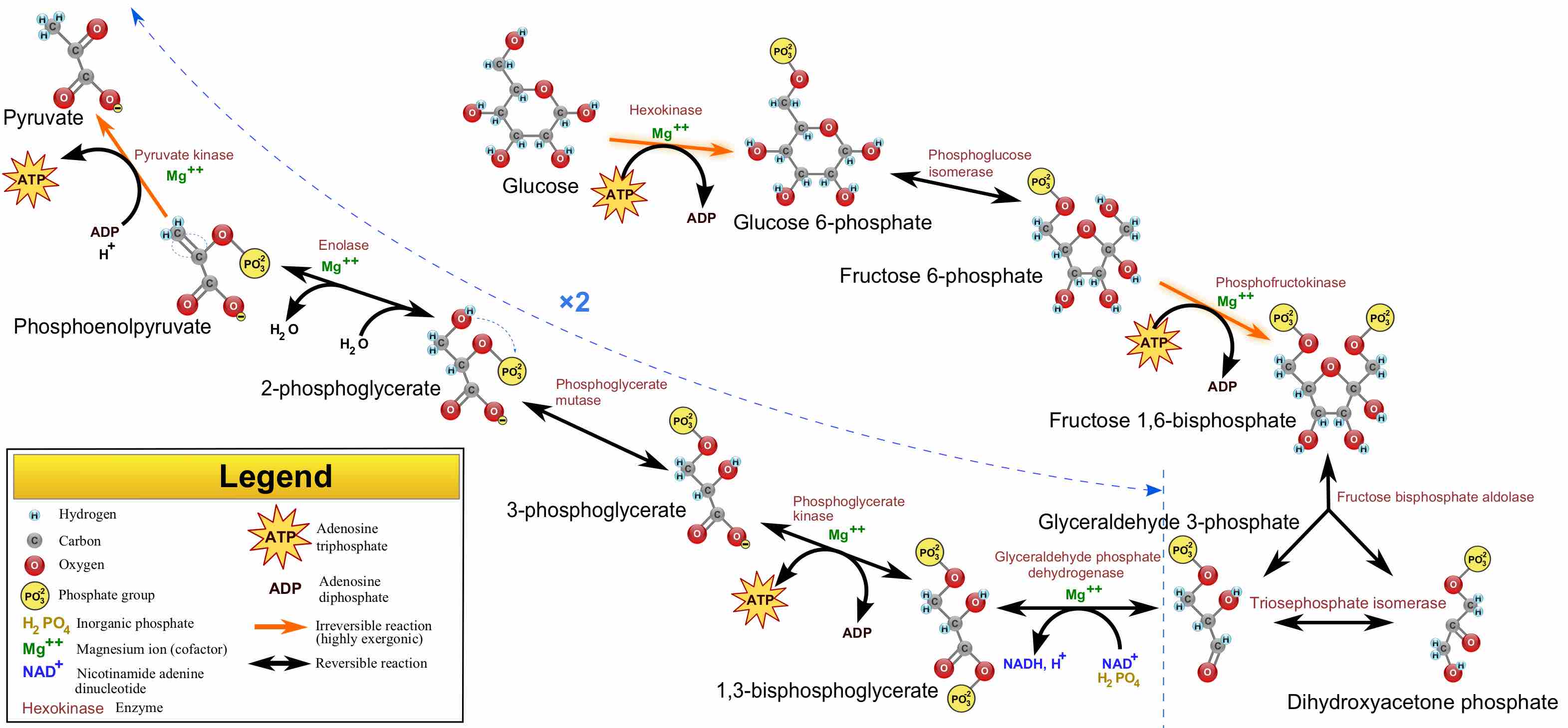 An overview of the glycolytic pathway. This pathway, comprised of a series of reactions, produces many intermediates and molecules utilized as substrates for biosynthesis in additional pathways.