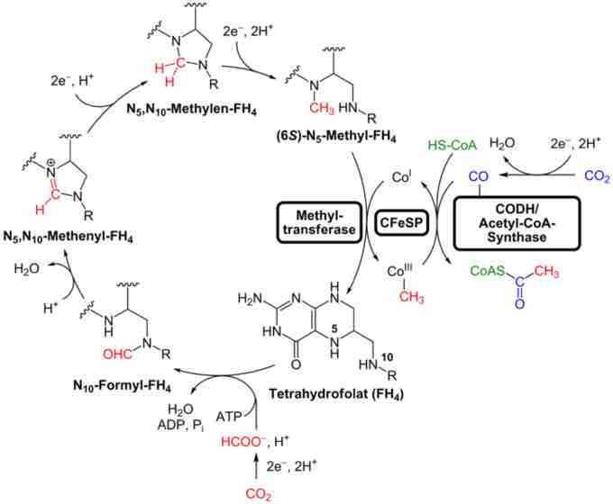 The acetyl-CoA pathway begins with the reduction of a carbon dioxide to carbon monoxide. The other carbon dioxide is reduced to a carbonyl group. The two major enzymes involved in these processes are carbon monoxide dehydrogenase and acetyl CoA synthase complex. The carbon dioxide that is reduced to a carbonyl group, via the carbon monoxide dehydrogenase, is combined with the methyl group to form acetyl-CoA. The acetyl-CoA synthase complex is responsible for this reaction.