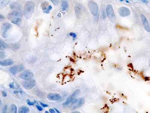 Immunohistochemical staining of H. pylori from a gastric biopsy