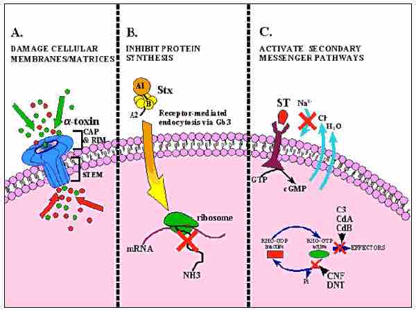 Bacterial toxins are typically classified under two major categories: exotoxins or endotoxins. Exotoxins are immediately released into the surrounding environment whereas endotoxins are not released until the bacteria is killed by the immune system. The release of toxins into the surrounding environment, regardless of when released, results in the disruption of metabolic pathways in the host eukaryote . These metabolic pathways include damaging cell membranes, disrupting protein synthesis, inhibiting neurotransmitter release, or activating the host immune system. The mechanisms of action by which toxins disrupt eukaryotic cell processes are dependent on the target. For example, the bacteria Listeria monocytogenes, associated with food-borne illnesses, specifically targets cholesterol by producing a pore-forming toxin protein, listeriolysin O. This exotoxin affects intracellular processes and creates unregulated pores within the cell membranes of the host. Another example of an exotoxin includes an enterotoxin produced by the bacteria Staphlycoccal aureus. S. aureus can producestaphylococcal enterotoxin B (SEB), associated with intestinal illness, which promotes activation of the immune system. Upon activation of the immune system, the release of large amounts of cytokines, inflammatory related molecules, causes significant inflammation. Lastly, an example of an endotoxin, includes the protein lipopolysaccharide (LPS) produced by gram-negative bacteria. The LPS is a component of the bacteria's outer membrane and promotes structural integrity. Upon destruction of the membrane by an immune response, the LPS is released and functions as a toxin.