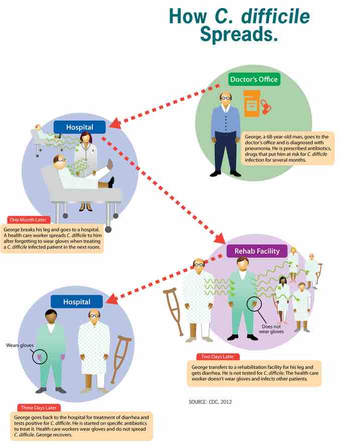 C. difficile is transmitted from person to person by the fecal-oral route. The organism forms large numbers of heat-resistant spores. These are not killed by alcohol-based hand cleansers or routine cleaning of surfaces. These spores remain viable in the hospital or nursing home environment for long periods of time. Because of this, the bacteria can be cultured from almost any surface in the hospital. Once spores are ingested by a patient, they pass through the stomach unscathed because of their acid-resistance. They germinate into vegetative cells in the colon upon exposure to bile acids, and multiply.