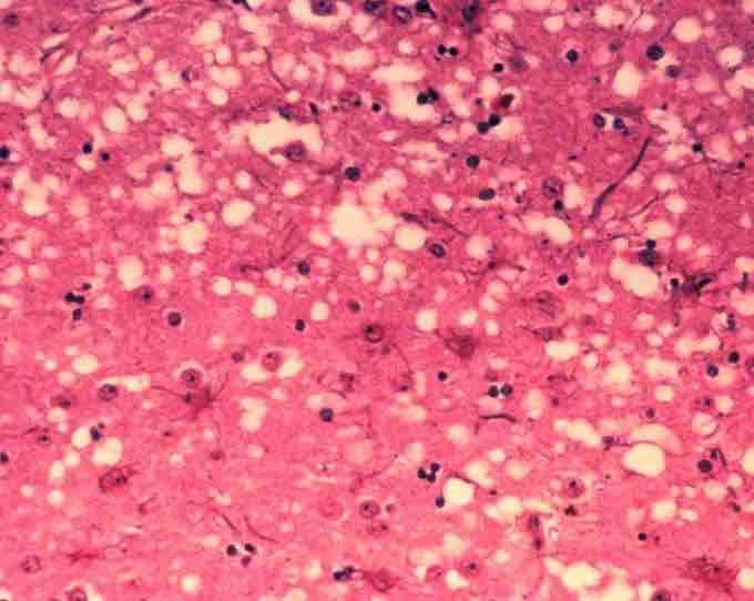 This micrograph of brain tissue reveals the cytoarchitectural histopathologic changes found in bovine spongiform encephalopathy. The presence of vacuoles, i.e. microscopic "holes" in the gray matter, gives the brain of BSE-affected cows a sponge-like appearance when tissue sections are examined in the lab.