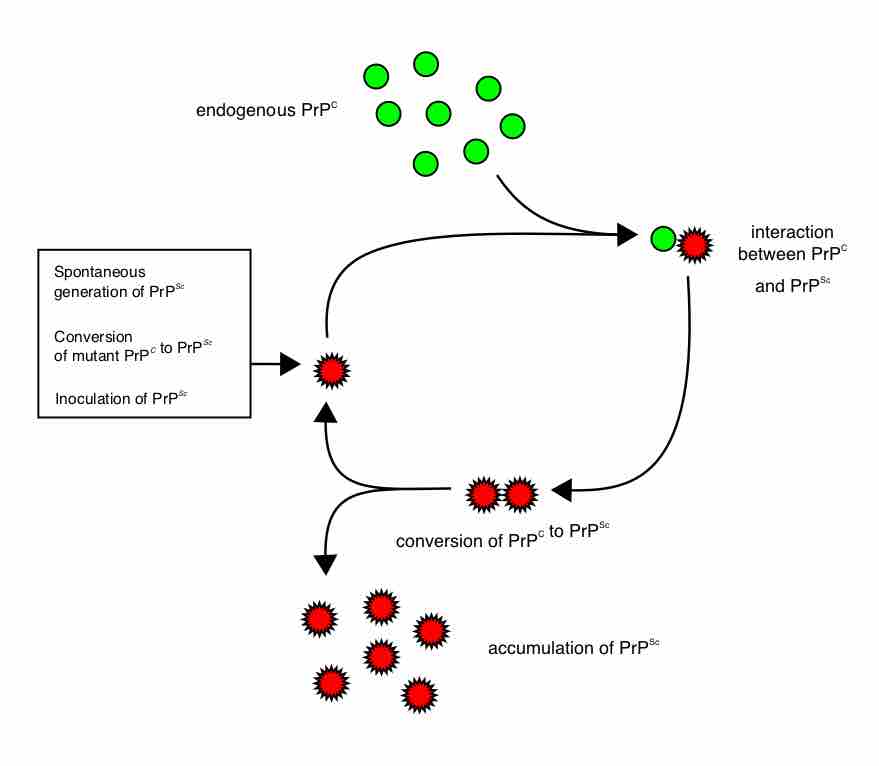 The incubation period of prion diseases is determined by the exponential growth rate associated with prion replication, which is a balance between the linear growth and the breakage of aggregates. Propagation of the prion depends on the presence of normally-folded protein in which the prion can induce misfolding; animals which do not express the normal form of the prion protein cannot develop nor transmit the disease.